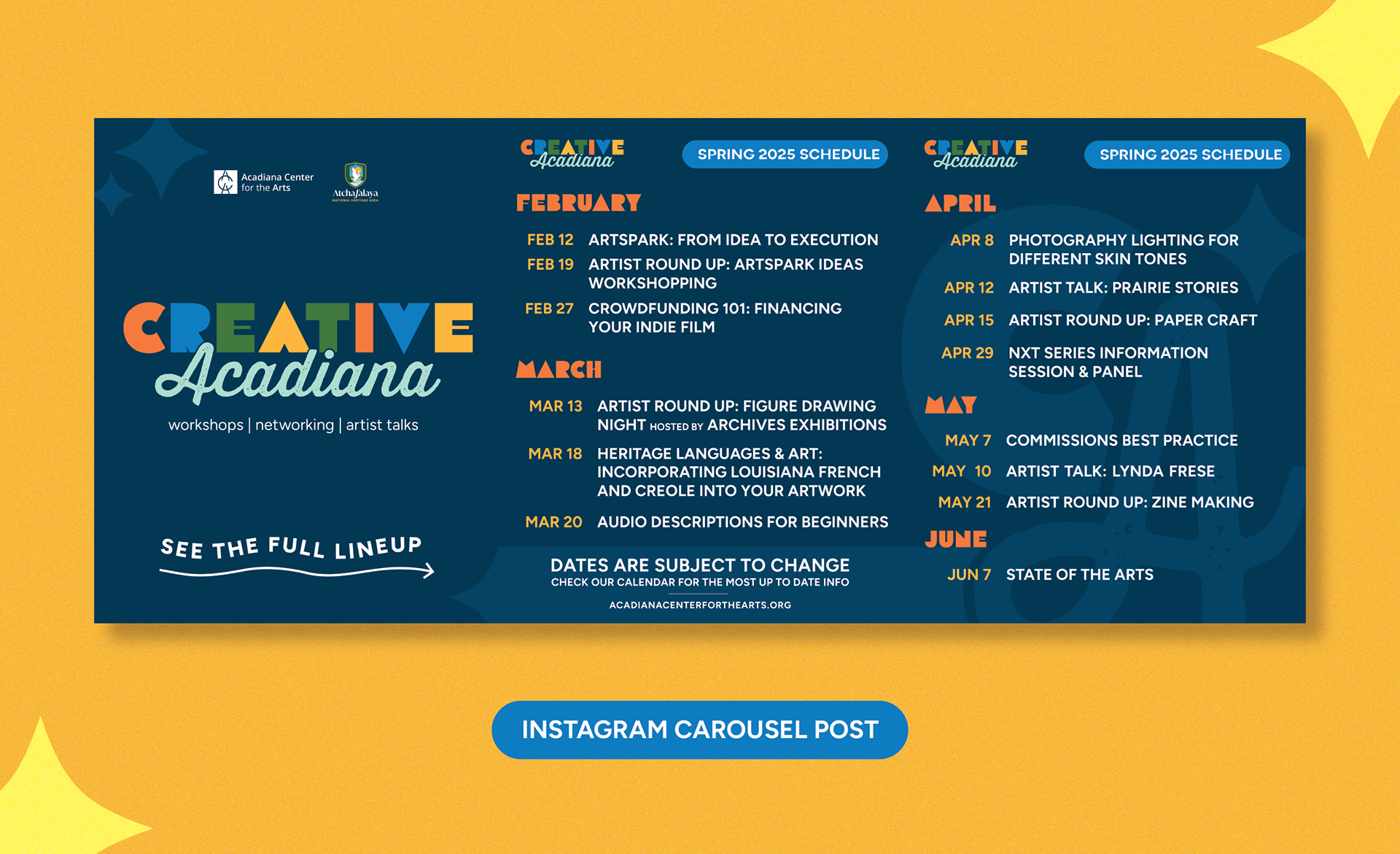 Creative Acadiana is a program offered by Acadiana Center for the Arts, located in downtown Lafayette. Creative Acadiana supports local artists, creatives, cultural bearers and makers by offering affordable (often free) classes, educational experiences, and professional development workshops. These resources are open to anyone who wishes to partake and are aimed at connection Lafayette's artists and fostering creativity. Though the program has been ongoing, it did not have an identity.